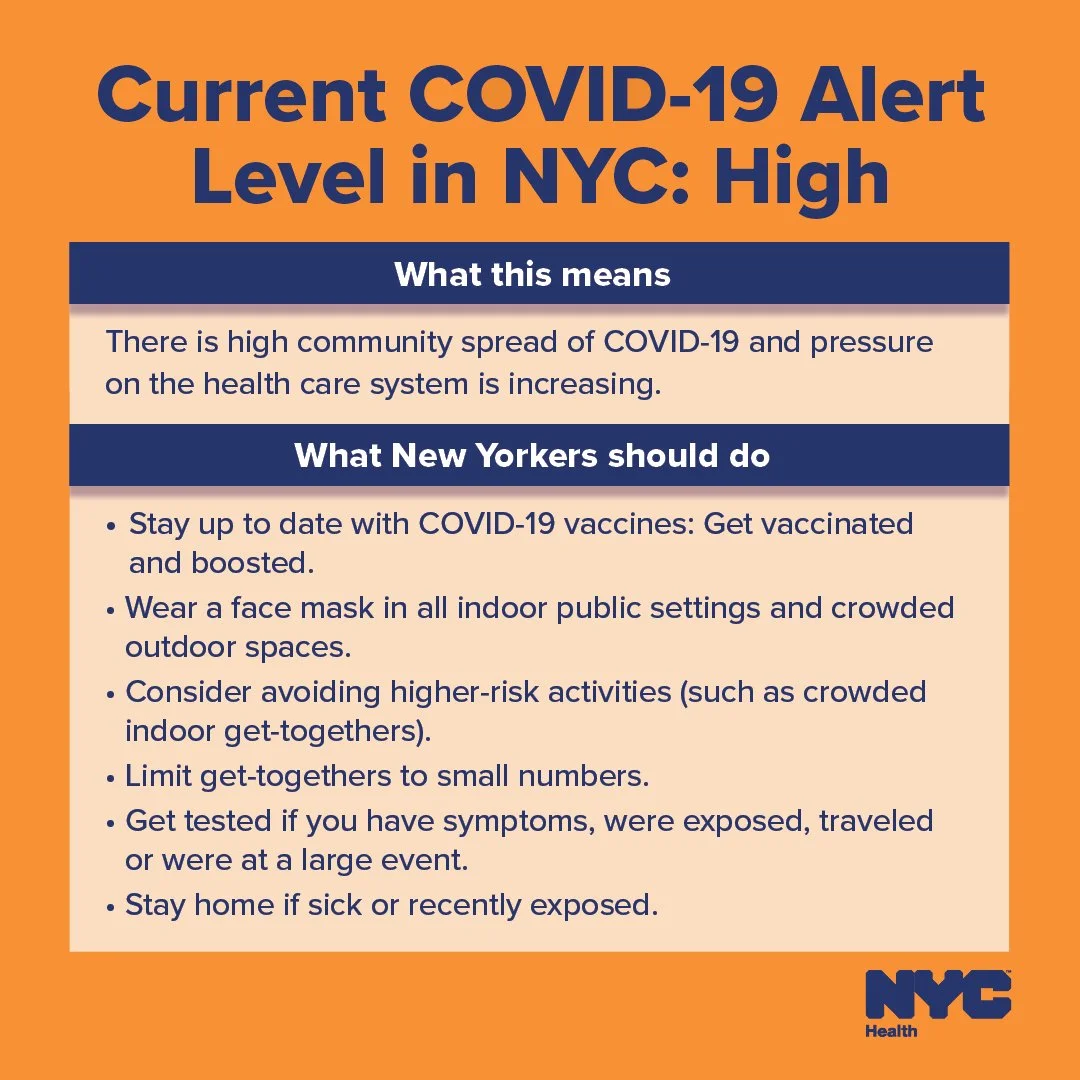 While we already required masks and up-to-date vaccinations, the NYCDOH also provides the following guidance during a High Alert: